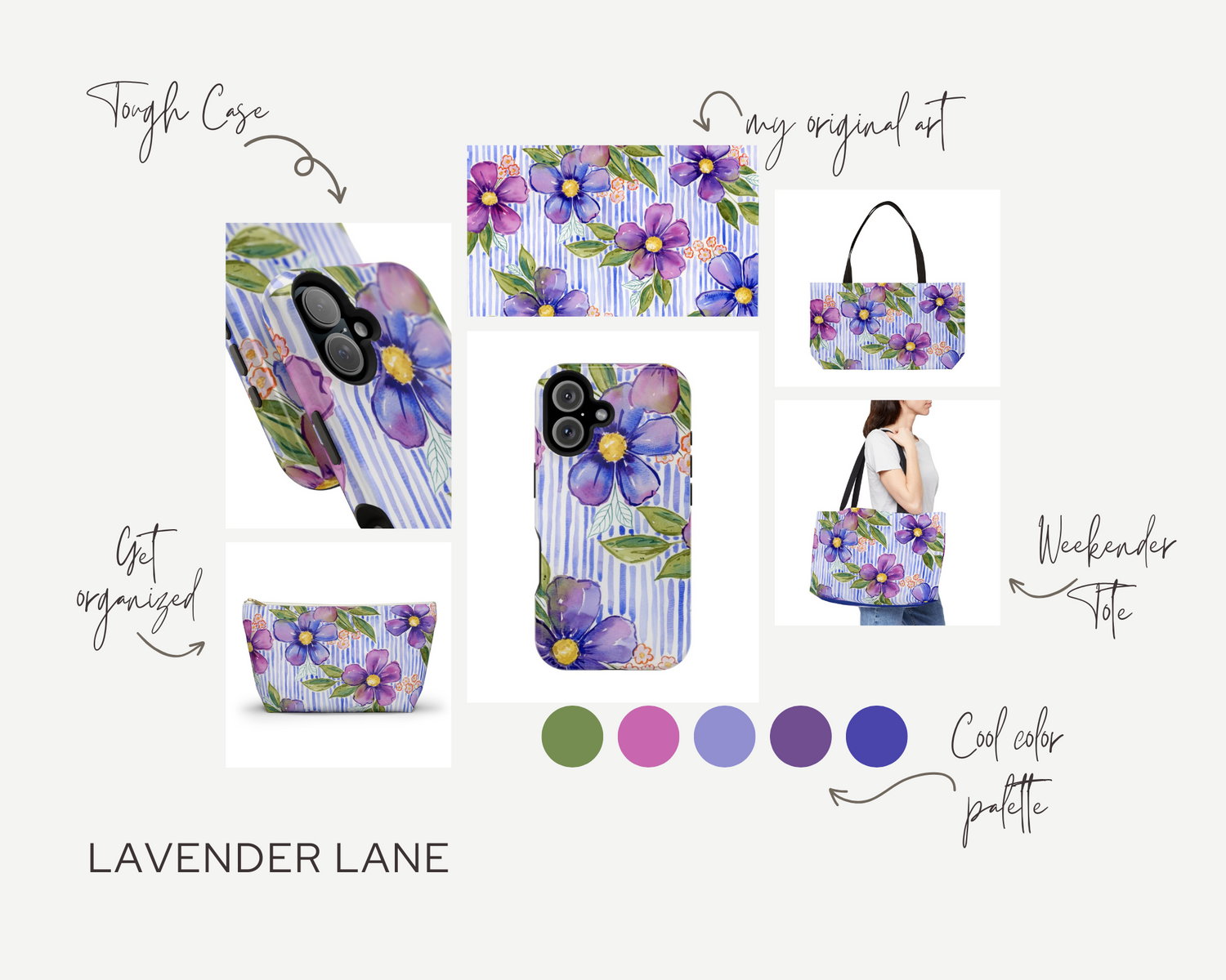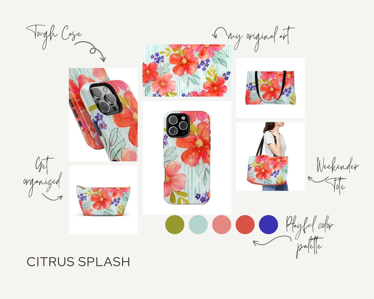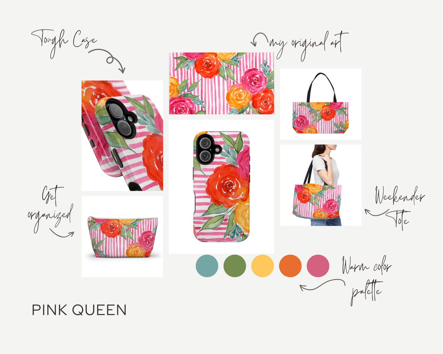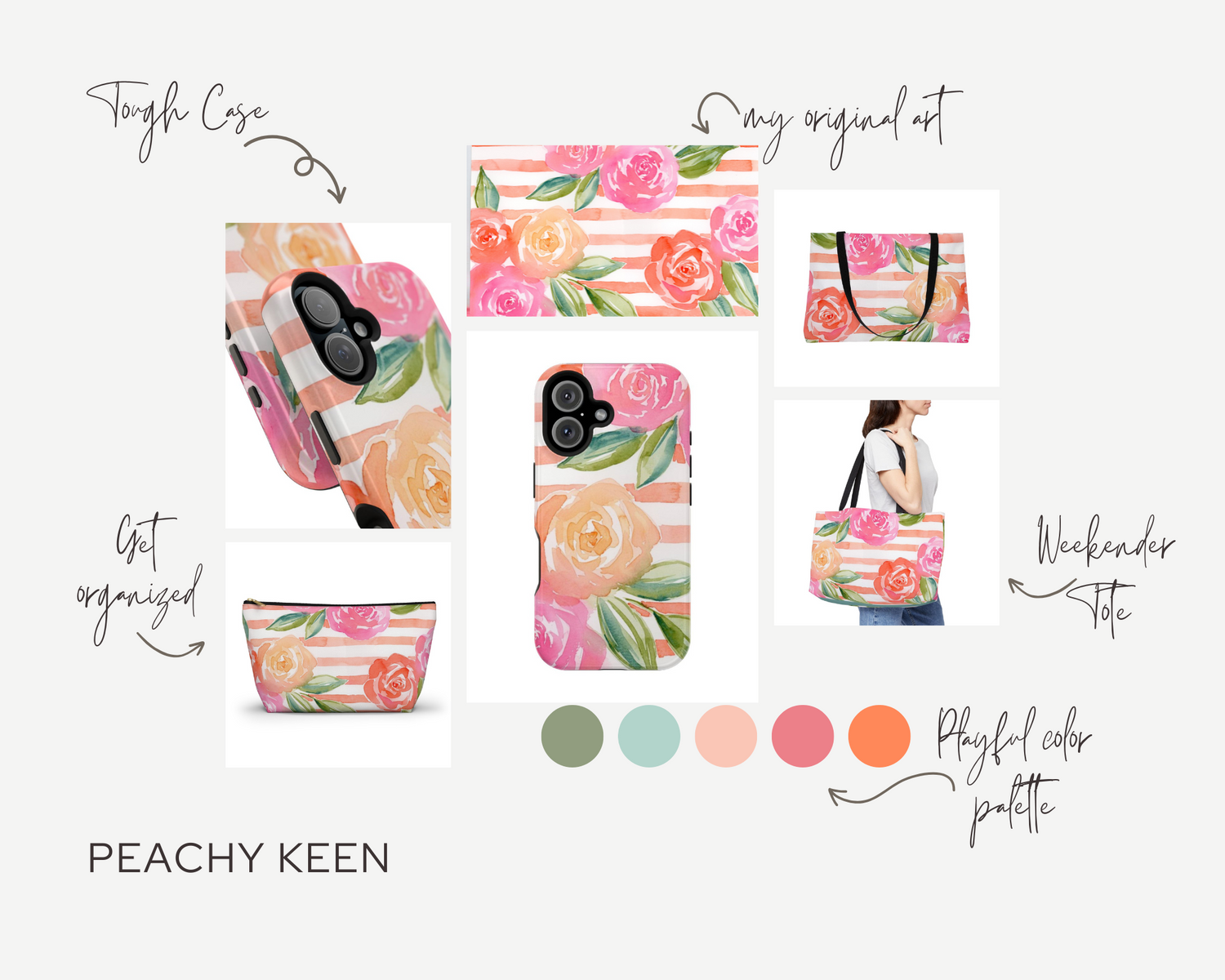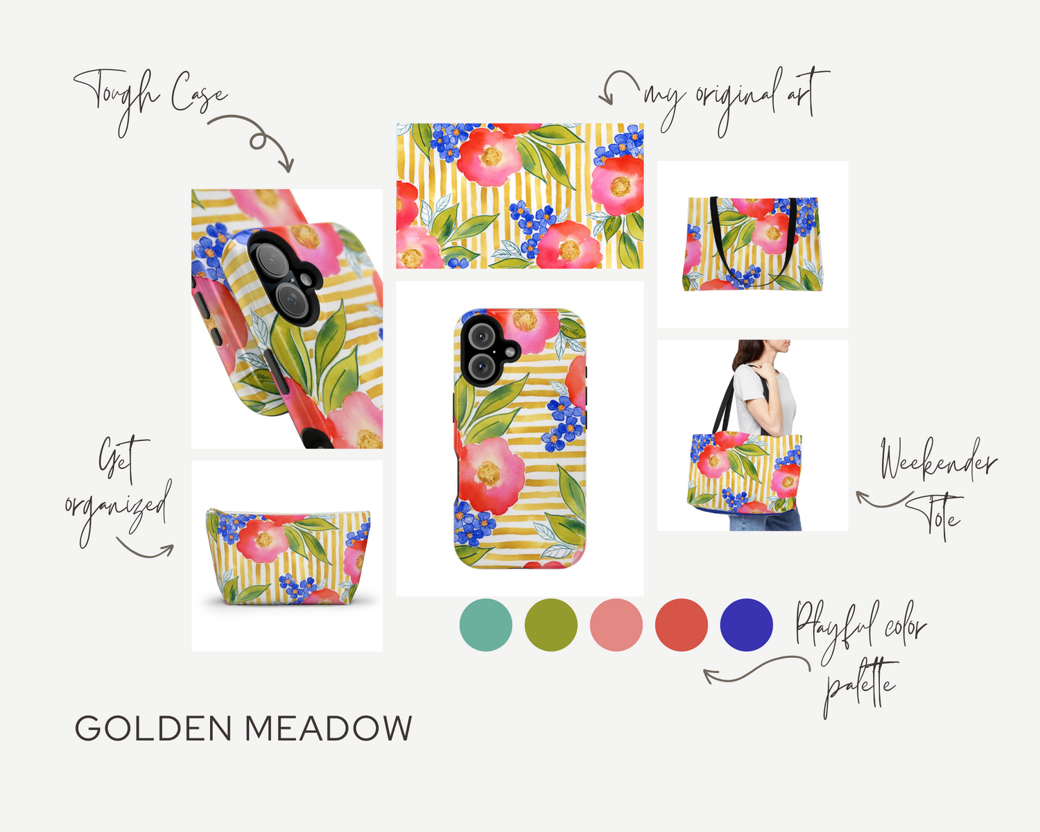 Bring a playful twist of elegance into your everyday with the Petals & Pinstripes Collection. Inspired by my original watercolor floral paintings, this collection combines vibrant, hand-painted blooms with classic pinstripe patterns for a fresh, colorful look. Each piece features my unique artwork and is designed to add beauty and joy to your day – whether it’s your phone case, zip pouch organizer, or roomy weekender tote bag.