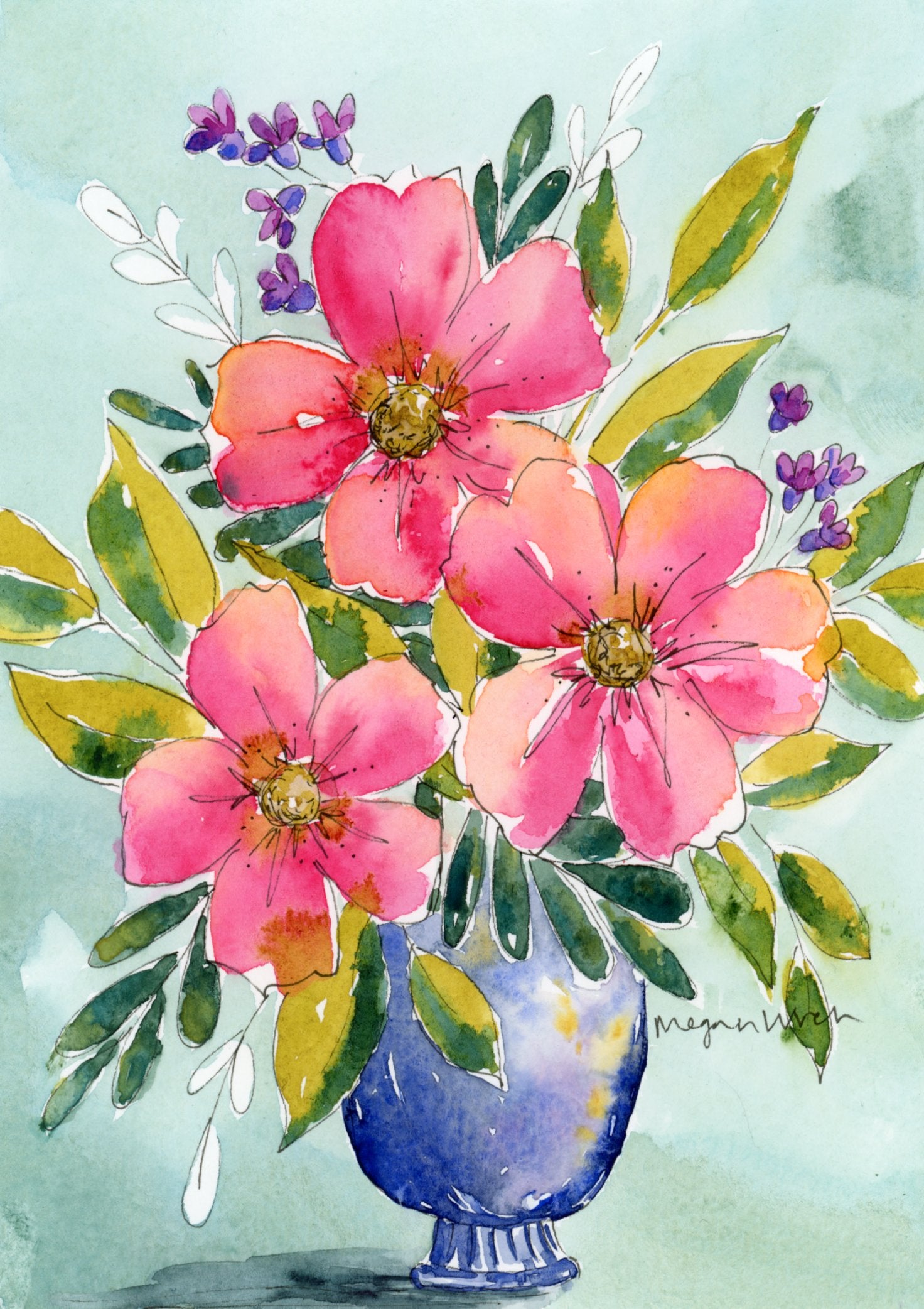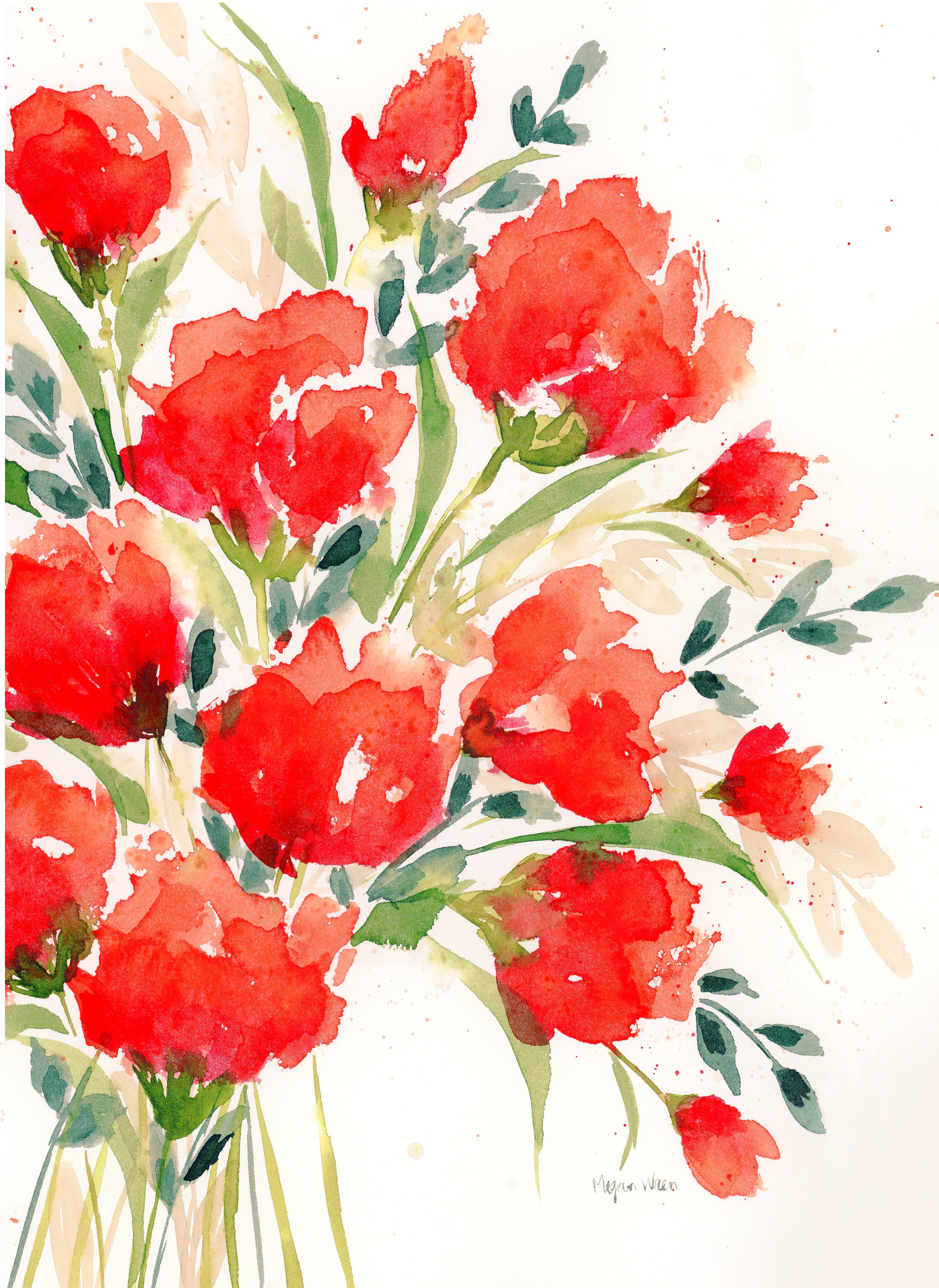 ShopLoose red flowers with fresh pops of green and deep navy accents create a vibrant, lively watercolor painting.