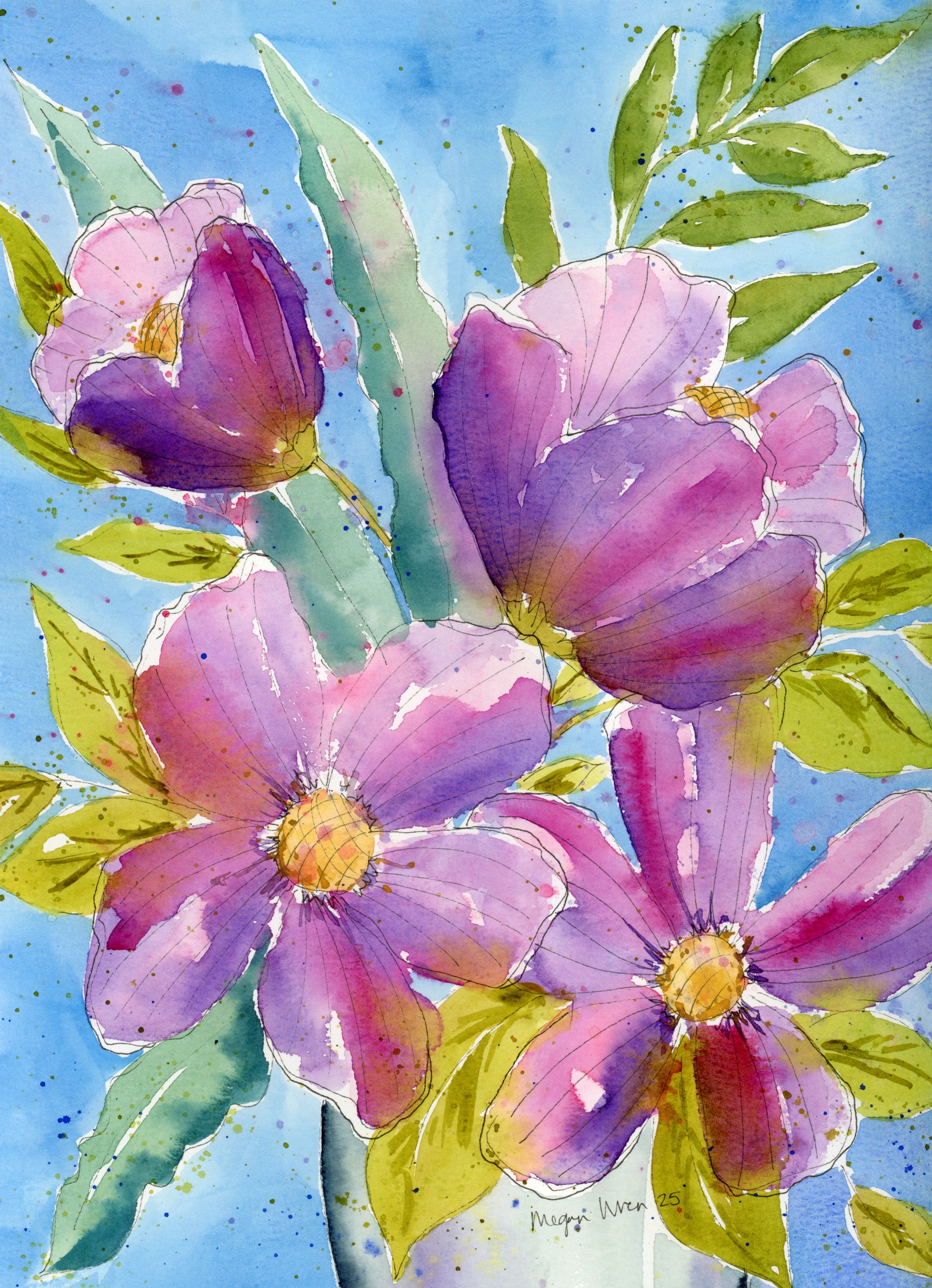 ShopLoose purple watercolor flowers with ink lines, lime green foliage and a bright blue background.