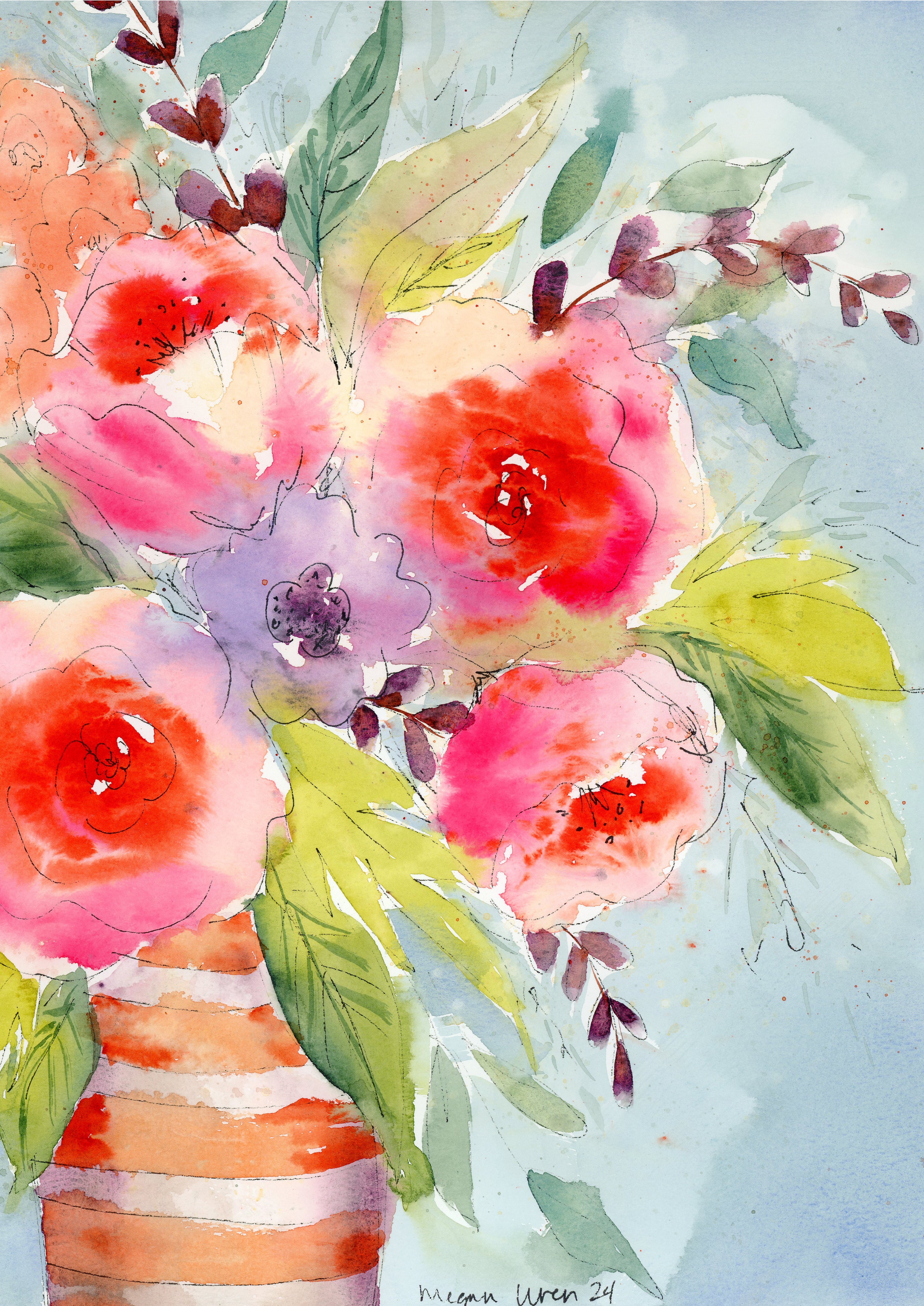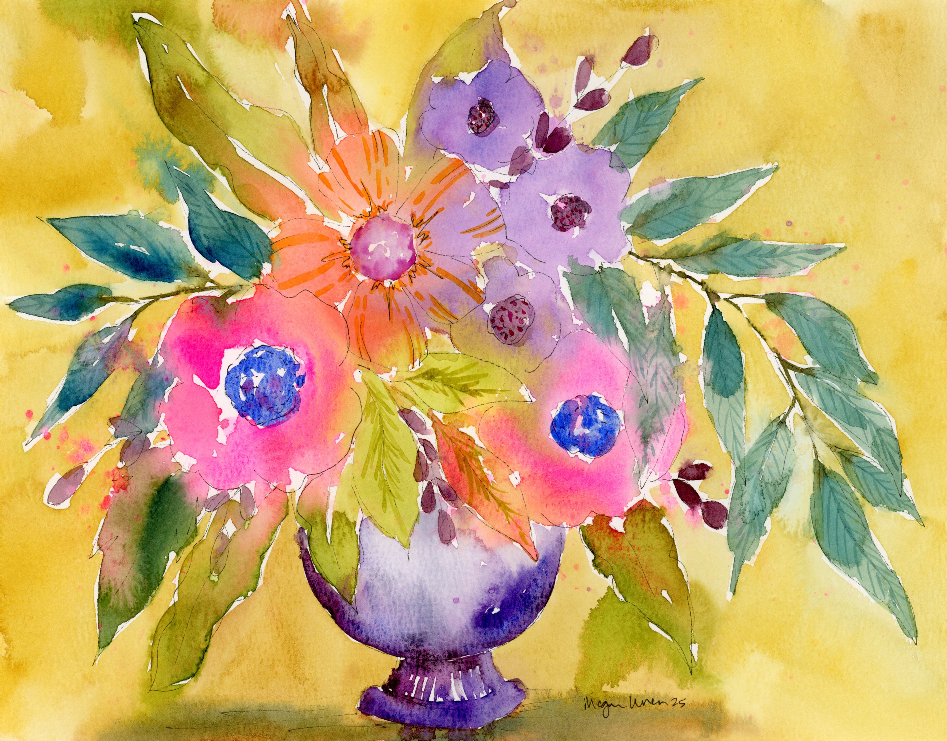 ShopA bright and lively watercolor bouquet, featuring bold orange, pink, and purple blooms in a purple vase. Inspired by the vibrant colors and joy found in nature's wildflowers.