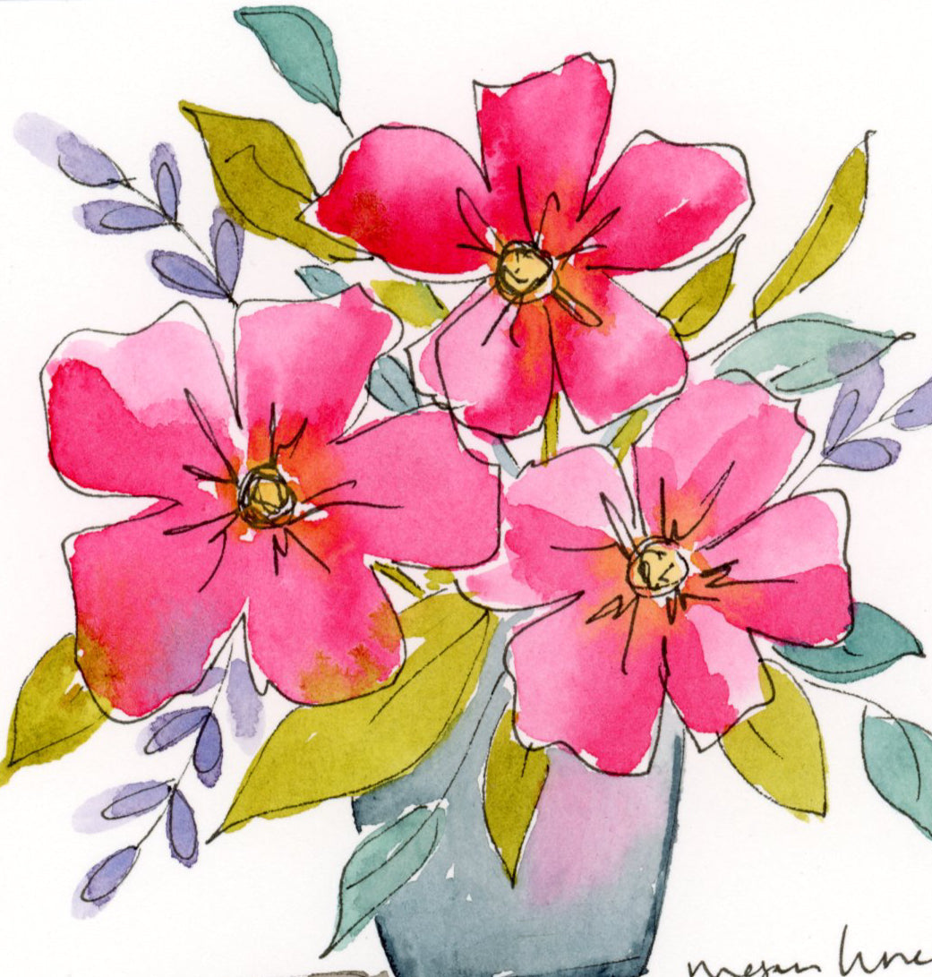 ShopBold ink lines dance with soft watercolor brushstrokes, featuring big pink blooms, hints of orange, and delicate yellow tulips in the loose floral painting.