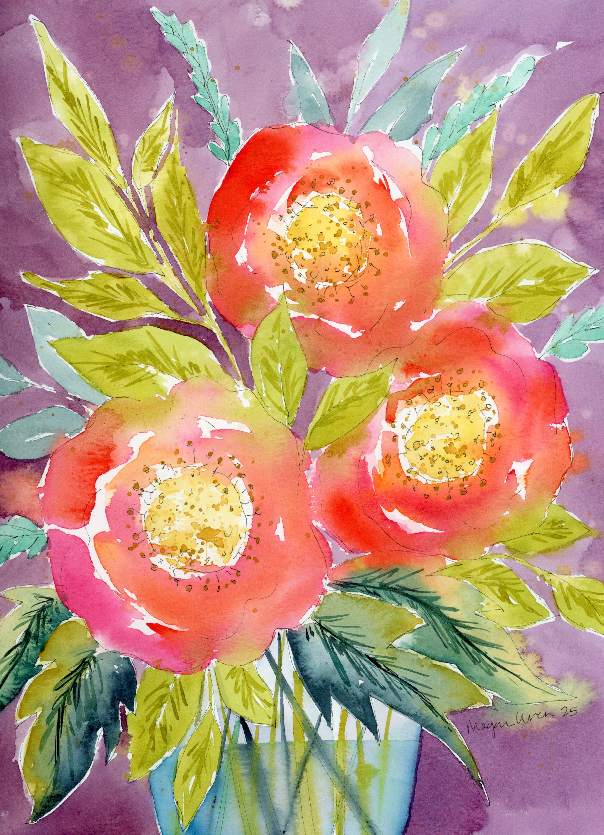 ShopA vibrant watercolor painting featuring big pink watermelon colored poppy blooms with lime green and soft aqua foliage against a purple background, bursting with bold and joyful color.