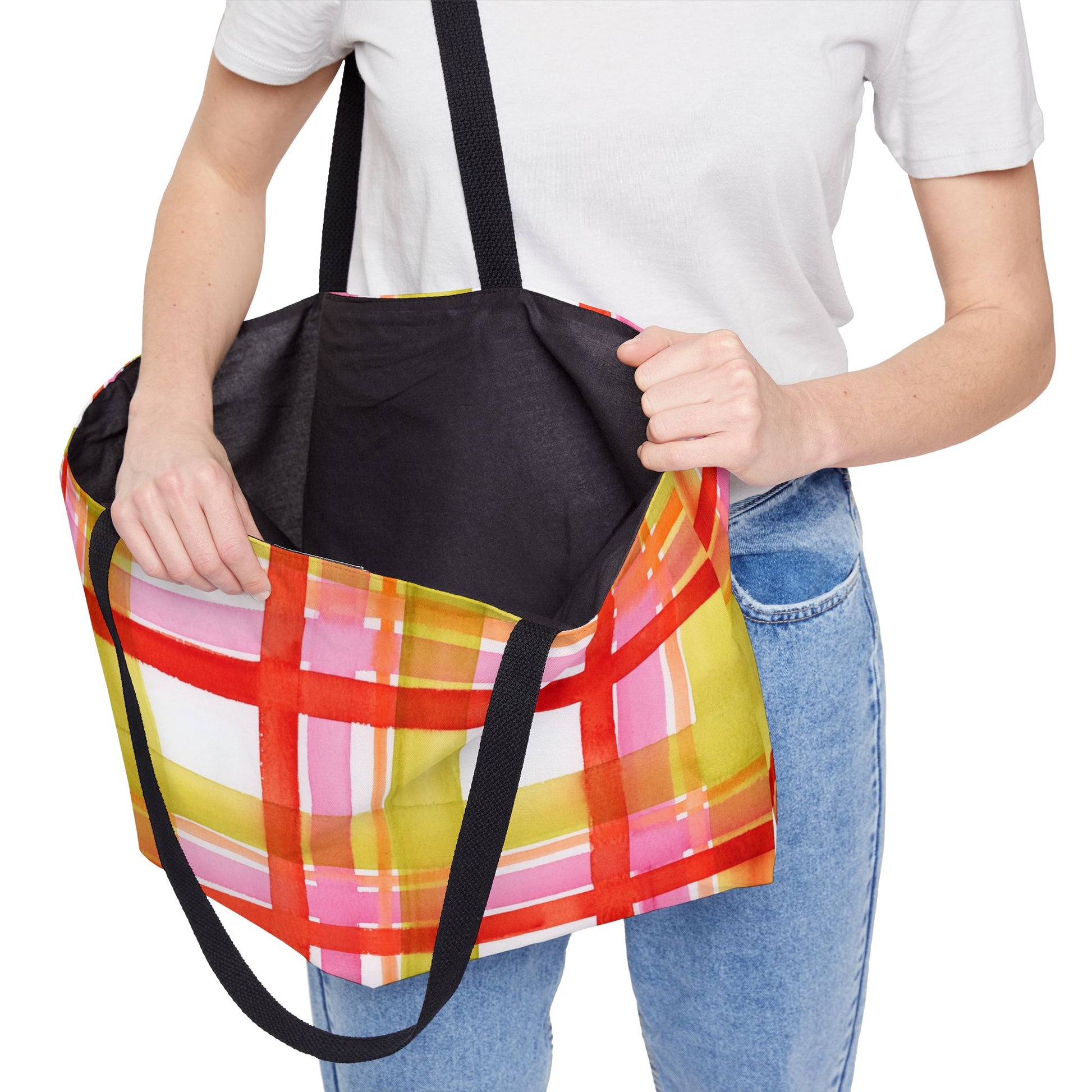 Bright Plaid Weekender Tote Bag - Large Watercolor Painted Tote, Great Gift for Mom, Teachers, Graduation - Travel Tote, Collage Bag,