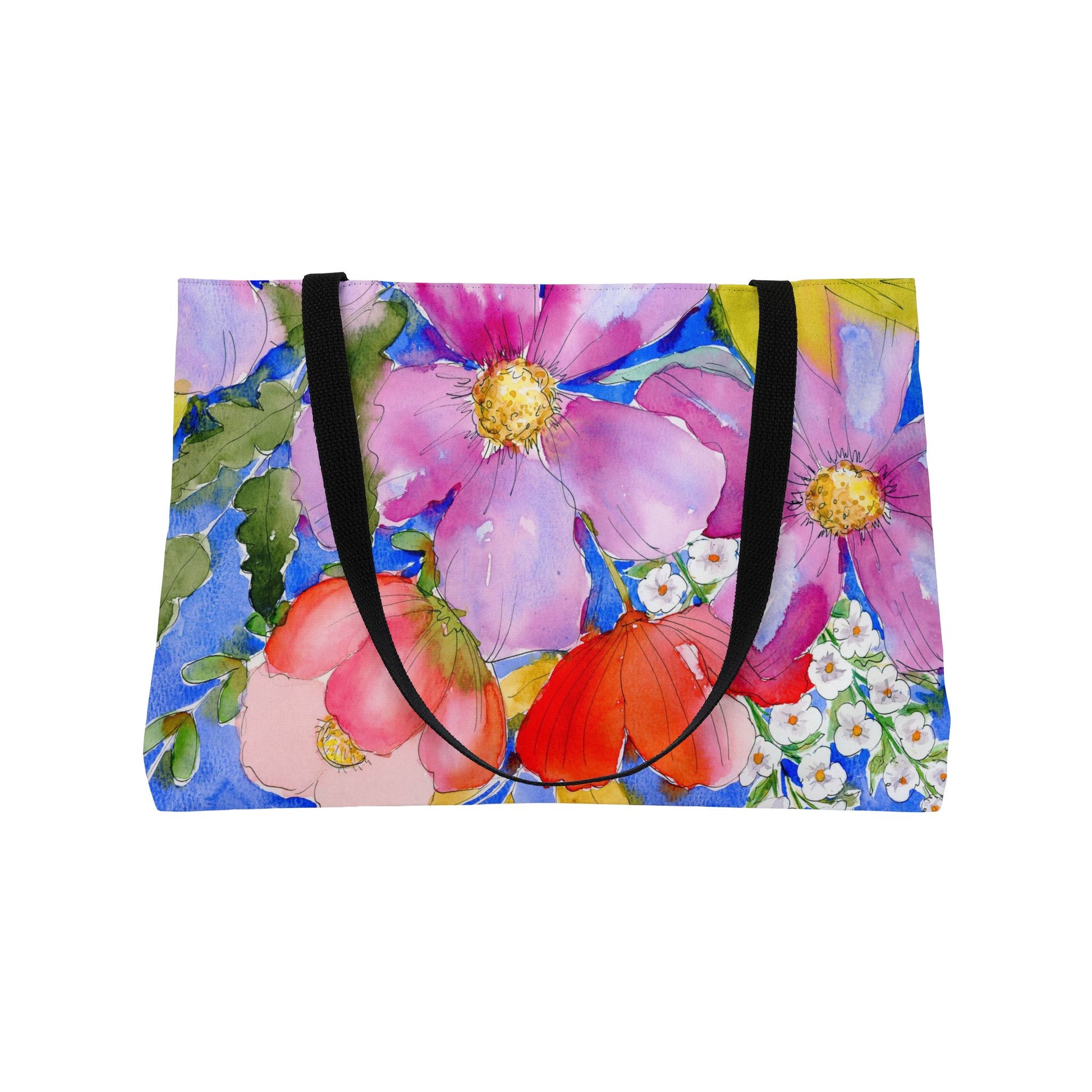 This large floral tote bag features images of my original watercolor paintings, adding color and joy into your world. Perfect for anyone on the go, it's a great gift for moms, teachers, graduates, and travelers heading to college. The colorful bold floral designs give off a lively and vibrant vibe, making it a versatile accessory for various occasions.