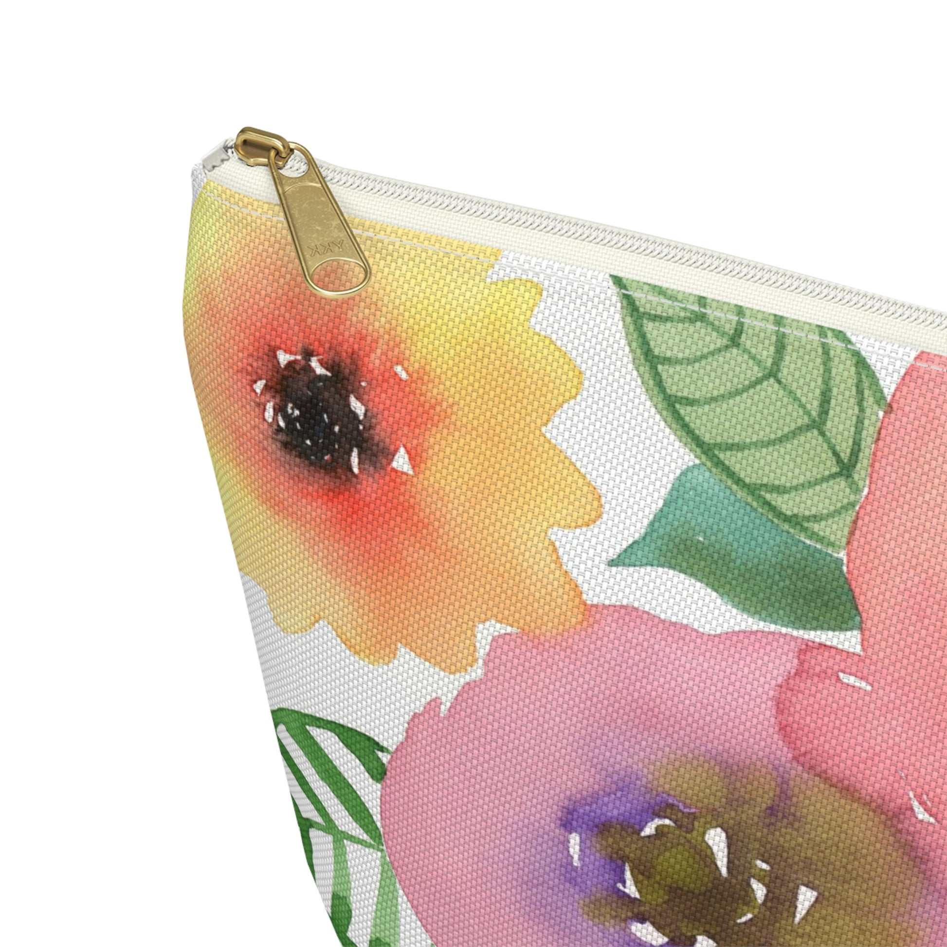 This accessory pouches is made with a my original watercolor artwork featuring colorful flowers. I want to bing color, joy and organization into your everyday. These pouches are well made small bags with non-woven laminate inside for easy cleaning. The pouch zips shut to keep your things safe and organized. They are perfect for makeup, traveling, daycare, school, and as gifts. With two sizes they are both practical and fun. Ideal for anyone one the go these pouches are assembled in the USA from globally sourced parts.