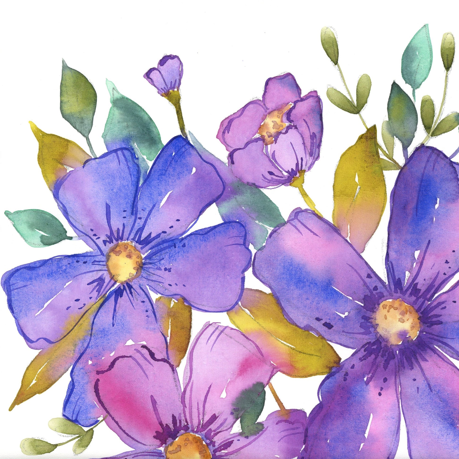 “Violet Embrace” is an original 11 x 14 watercolor painting on canvas-textured watercolor paper. Bold, expressive blooms unfold across the piece in shades of violet, cobalt blue, and soft fuchsia, balanced by fresh lime-green foliage and touches of teal accents. The loose, flowing brushstrokes create a sense of movement and harmony, inviting the viewer into a vibrant yet soothing embrace of color